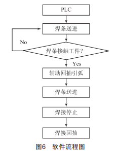 在系統(tǒng)中實(shí)現(xiàn)焊條輔助回抽引弧功能稍微復(fù)雜。利用霍爾電流傳感器的輸出電壓信號接入三菱Fx3U系列PLC的AI模塊Fx3U-4AD后,由PLC處理該信號,并和閾值相比較。如果焊條送進(jìn)時(shí)與焊接工件相接觸形成短路,則Fx3U-4AD接收到的電壓信號大于閾值,此時(shí)通過程序讓Y2斷開,Y3置閉合1s,輔助焊條回抽實(shí)現(xiàn)引弧過程,然后繼續(xù)恢復(fù)Y2的閉合,斷開Y3,繼續(xù)進(jìn)行焊接過程。如果Fx3U-4AD接收到的電壓信號小于閾值,則說明焊條尚未碰到焊接工件,繼續(xù)送進(jìn)焊條。以上程序可用圖6的軟件流程進(jìn)行說明。