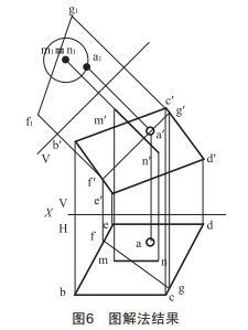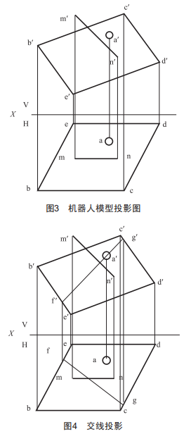 (1)求解A點(diǎn)運(yùn)動(dòng)軌跡所在平面與平面BCDE的交線。首先畫出抽象模型投影圖,如圖3所示,可以看出MN是一條正平線。A點(diǎn)繞MN旋轉(zhuǎn),可知A點(diǎn)的軌跡應(yīng)是正垂面。根據(jù)正垂面的性質(zhì)可知A點(diǎn)的軌跡在正面投影具有積聚性,并且積聚在垂直于MN正面投影m'n'的一條直線上。過a'作m'n'的垂線,并且與b'c'd'e'交于f'g'。根據(jù)積聚性可知f'g'就是兩個(gè)平面的交線,根據(jù)投影規(guī)律再作出交線的水平投影fg,如圖4所示。