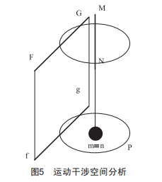 (2)判斷交線與A點(diǎn)軌跡的關(guān)系。要判斷交線與A點(diǎn)的軌跡圓之間的關(guān)系,首先同樣需要做空間分析,干涉問題空間分析如圖5所示。從圖5可以看出,要找出A點(diǎn)的運(yùn)動(dòng)范圍,必須作出A點(diǎn)軌跡圓的實(shí)形,A點(diǎn)的軌跡圓垂直于軸MN。當(dāng)把MN用換面法換成投影面的垂直線時(shí),此時(shí)軌跡圓是新變換平面的平行面,即可反映軌跡圓實(shí)際運(yùn)動(dòng)范圍。通過判斷交線與軌跡圓的投影是否存在交點(diǎn),即可判斷在機(jī)器人運(yùn)動(dòng)過程中是否存在干涉問題。