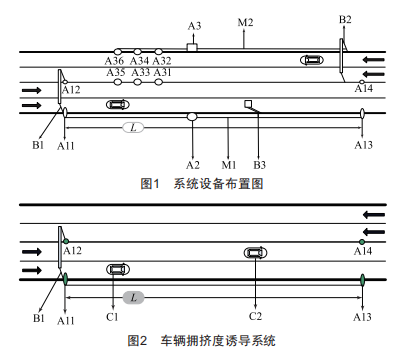 車輛擁擠度誘導系統(tǒng)如圖2所示,整個誘導系統(tǒng)由車輛計數(shù)器發(fā)射裝置A11和A13、車輛計數(shù)器接收裝置A12和A14、門架式情報板B1組成。