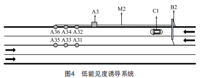 低能見度誘導系統(tǒng)如圖4所示,該系統(tǒng)主要由能見度測試儀A3、輪廓指示燈(A31、A32、A33、A34、A35和A36)、傳輸光纖M2和門架式情報板B2組成。