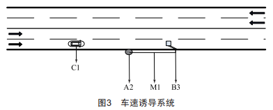 車速誘導系統(tǒng)如圖3所示,該系統(tǒng)主要由車輛實時測速裝置A2、懸臂式情報板B3和傳輸光纖M1組成。圖3中A2為車輛實時測速裝置,對經(jīng)過車輛車速進行實時監(jiān)測,同時對車輛進行車牌抓拍:B3為懸臂式情報板,當有車輛超過規(guī)定閾值車速時,則會觸發(fā)懸臂式情報板,顯示該車輛車牌號、超速時車輛速度、超速比例和超速位置:M1為傳輸光纖,為整個系統(tǒng)的通信信號和控制信號進行傳輸。
