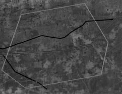 圖1為擬開發(fā)風電場相對位置,其中黑線為場區(qū)內(nèi)已建成的高壓輸電線路。同時,場區(qū)內(nèi)有若干居民區(qū),4條等級公路,1條省管禁用河道,若干墳墓等。在風機排布優(yōu)化過程中,需要根據(jù)相關法律法規(guī)、當?shù)仫L土人情等進行合理考慮,規(guī)劃避讓。
