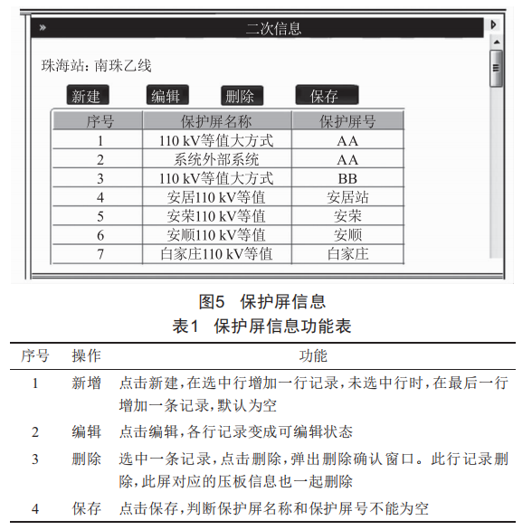保護屏表格固定顯示三列,顯示為序號、保護屏名稱、保護屏號。界面如圖5和表1所示,最上面顯示"廠站名稱:設備名稱"。