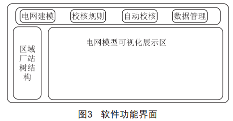 系統(tǒng)界面主要分為功能按鈕區(qū)、區(qū)域廠站樹結(jié)構區(qū)、電網(wǎng)模型可視化展示區(qū),如圖3所示。功能按鈕區(qū)由電網(wǎng)建模、校核規(guī)則、自動校核、數(shù)據(jù)管理四個部分組成。