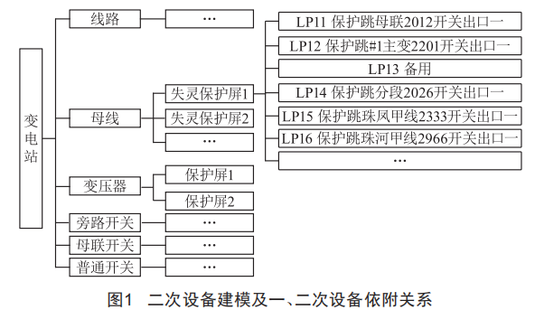 變電二次操作項建模及智能防誤校驗系統(tǒng)通過電網(wǎng)模型xML文件和遙信遙測量DT文件獲得電網(wǎng)設備、運行方式、拓撲連接關系,再通過友好的人機界面建立二次設備模型,形成一次設備與二次設備的依附關系,如圖1所示,并對二次設備進行多維度屬性的描述,形成電網(wǎng)模型基礎數(shù)據(jù),實現(xiàn)一/二次設備建模、一/二次設備智能防誤校驗等功能,并通過可視化界面進行展示。