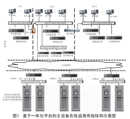 大唐廣西分公司集控中心主設(shè)備在線監(jiān)測系統(tǒng)基于一體化管控平臺,實現(xiàn)數(shù)據(jù)的統(tǒng)一采集、處理、存儲和分析。一體化平臺涉及安全I區(qū)、II區(qū)和III區(qū),跨安全區(qū)之間的信息交互滿足電力系統(tǒng)二次安全防護的要求。系統(tǒng)結(jié)構(gòu)及組成如圖1所示。