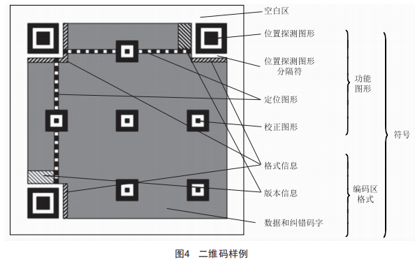 實(shí)現(xiàn)二維碼的生成與識別對設(shè)備管理系統(tǒng)至關(guān)重要,二維碼的構(gòu)成如圖4所示。位置探測圖形是定位圖案,一共有3個(gè),用于標(biāo)記二維碼的矩形大小。這3個(gè)定位圖案中的白邊叫位置探測圖形分隔符。之所以是3個(gè)而不是4個(gè),是因?yàn)?個(gè)就可以標(biāo)識一個(gè)矩形了。定位圖形也是用于定位的,原因是二維碼有40種尺寸,尺寸過大了之后需要有根標(biāo)準(zhǔn)線,否則掃描的時(shí)候可能會掃歪了。