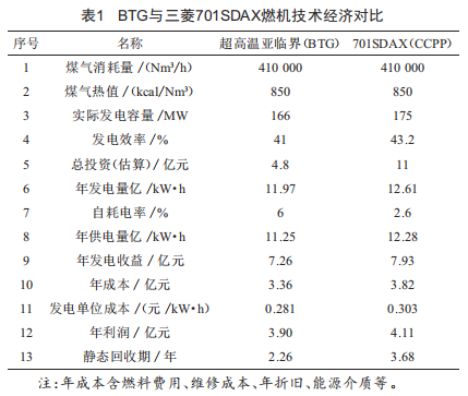 下面僅對(duì)超高溫亞臨界常規(guī)發(fā)電(BTG)與三菱701SDAx燃機(jī)做技術(shù)經(jīng)濟(jì)對(duì)比,如表1所示。
