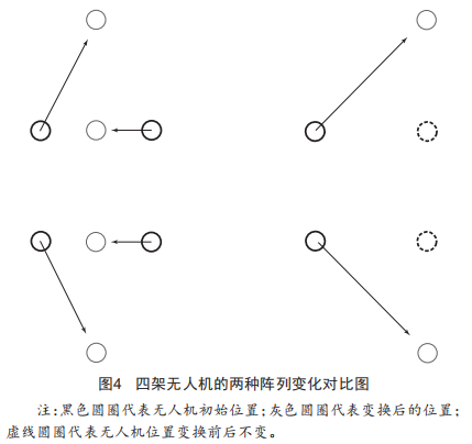 如圖2~圖3所示,在室內(nèi)環(huán)境下進(jìn)行編隊(duì)測(cè)試,其中圖2表示兩架無人機(jī)由豎向直線陣型編隊(duì)自主變換為橫向直線陣型編隊(duì),變換的方式為以初始狀態(tài)下兩架無人機(jī)的距離為直徑、然后以圓弧線路進(jìn)行變換:圖3表示四架無人機(jī)由方陣編隊(duì)自主變換為直線陣型編隊(duì),變換方式為如圖4左側(cè)所示,以方陣的邊長(zhǎng)為參考距離3,右邊兩臺(tái)向左平移參考距離的一半即3/2,左下角的無人機(jī)的移動(dòng)路線與左下角無人機(jī)和右下角無人機(jī)開始位置之間的連線形成609并向右下角移動(dòng)√53/2的距離:同理,左上角的無人機(jī)的移動(dòng)路線與左上角無人機(jī)和右上角無人機(jī)開始位置之間的連線形成609并向右上角移動(dòng)√53/2的距離。圖4的右側(cè)表示另一種編隊(duì)的動(dòng)態(tài)變換方法,即右邊兩臺(tái)無人機(jī)保持位置不變,左下角無人機(jī)以459方向向右下角移動(dòng)√23的距離:同理,左上角無人機(jī)以459方向向右上角移動(dòng)√23的距離。兩種編隊(duì)變換的方法對(duì)比,圖3的編隊(duì)變換方法即圖4左側(cè)的方法所花費(fèi)的時(shí)間更少,因?yàn)榍罢咧换ㄙM(fèi)了移動(dòng)√53/2距離的時(shí)間,在完成移動(dòng)√53/2距離時(shí),3/2的距離已提前完成移動(dòng):然而后者需要花費(fèi)移動(dòng)距離√23的時(shí)間,因此前者的編隊(duì)變換方式更佳。
