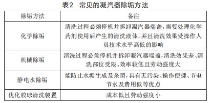 (2)凝汽器換熱面清潔度的提高。生物臟污、機(jī)械臟污和鹽類(lèi)臟污等對(duì)火電廠汽輪機(jī)組的煤耗有很大影響,如污垢問(wèn)題造成凝汽器端差升高、冷卻管垢下腐蝕和泄漏、冷卻水量及真空度下降,這些都會(huì)導(dǎo)致煤耗的上升(表2為常見(jiàn)的凝汽器除垢方法)?,F(xiàn)階段火電廠常用的凝汽器清洗裝置為膠球清洗裝置,其可在不停機(jī)的前提下連續(xù)工作,但受到凝汽器水室存在死角或渦流、收球裝置上的柵網(wǎng)板關(guān)閉不嚴(yán)、循環(huán)水壓力不夠、冷卻管壁發(fā)生脫落或剝離等因素的影響,膠球的收球率偏低,為此可采取如下解決措施:檢修過(guò)程中如果發(fā)現(xiàn)水室端蓋、水室隔板、管板銜接處等膠球聚集的死角,可以通過(guò)加裝導(dǎo)流板來(lái)改變此處的水流方向,從而避開(kāi)死角:可以通過(guò)對(duì)執(zhí)行機(jī)構(gòu)的限位進(jìn)行調(diào)整來(lái)確保收球裝置上的柵網(wǎng)板關(guān)閉到位:可將一臺(tái)循環(huán)水泵安裝在膠球清洗前,通過(guò)循環(huán)水壓力的增大來(lái)增加膠球的通行能力:可以用不銹鋼管來(lái)替代銅管,有效解決冷卻管結(jié)垢的問(wèn)題。