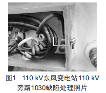 通過系統(tǒng)監(jiān)控及數(shù)據(jù)分析,發(fā)現(xiàn)2016年9月份110kV東鳳變電站110kV旁路1030代供1103期間的電流回路數(shù)據(jù)異常,且未代路期間有殘余電流,正向有功總有明顯的增量。發(fā)現(xiàn)異常后馬上發(fā)起異常工單,運維人員現(xiàn)場進行檢測,發(fā)現(xiàn)接線盒面板右側(cè)固定螺絲緊挨的電纜芯外皮略有破損,通過右側(cè)固定螺絲接地,并于當日完成故障消缺(圖1)。