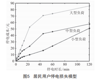 根據(jù)不同體量的居民小區(qū),本文分別建立了小型、中型、大型居民負(fù)荷的停電成本模型該模型反映了停電成本與停電時(shí)長的映射關(guān)系,如圖5所示。