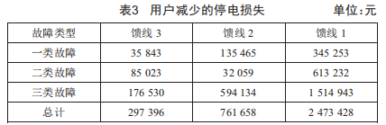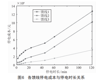 圖6所示為各饋線停電損失與停電時(shí)長關(guān)系。饋線1包含工業(yè)負(fù)荷最多,相同停電時(shí)長下,饋線1的停電損失最大:饋線3主要由居民用電負(fù)荷組成,相同停電時(shí)長下,饋線3停電損失最小。