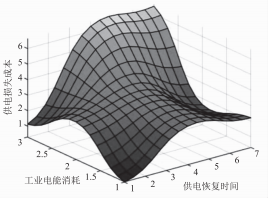 本文利用ANF1s對21個(gè)工業(yè)用戶數(shù)據(jù)進(jìn)行分析,得出了工業(yè)停電成本與電能消耗、供電恢復(fù)時(shí)間、停電過程特性、停電時(shí)長存在映射關(guān)系的結(jié)論。圖3所示為工業(yè)用戶停電損失成本與工業(yè)電能消耗、供電恢復(fù)時(shí)間的關(guān)系。由圖可知,停電損失與供電恢復(fù)時(shí)間成正比。