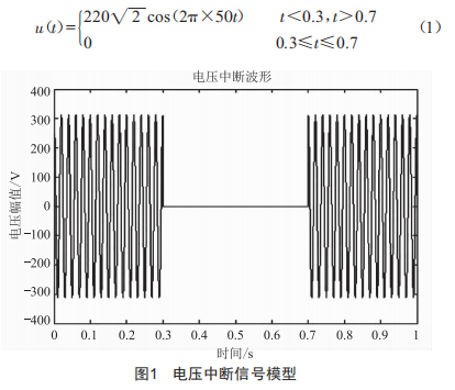 本文針對電壓中斷波形進(jìn)行Mat1ab仿真實驗,電壓中斷波形如圖1所示,電壓有效值、頻率以及采樣頻率與電壓驟降波形相同,電壓在t=0.3s發(fā)生中斷,于t=0.7s時恢復(fù),持續(xù)時間為0.4s,數(shù)學(xué)模型如式(1)所示: