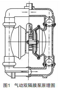 氣動(dòng)雙隔膜泵主要由泵殼、隔膜、軸、進(jìn)氣閥組件、排氣閥組件、外隔膜套件板、內(nèi)隔膜套件板等組成,如圖1所示。