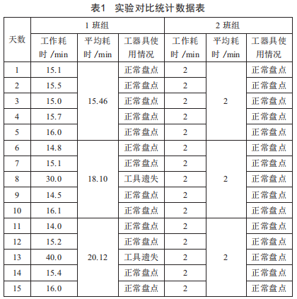 從表1中可以看出,由于工作完成后要整理、核對(duì)工具并及時(shí)裝箱,兩個(gè)班組在做三種同樣的工作時(shí),使用智能聯(lián)網(wǎng)工具箱的2班組明顯節(jié)省了工作時(shí)間,并且沒有出現(xiàn)任何工具丟失等異常情況。