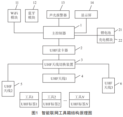 本文設(shè)計(jì)了一種智能聯(lián)網(wǎng)工具箱,結(jié)構(gòu)如圖1所示,其主要由主控制器、WiFi模塊、藍(lán)牙模塊、聲光報(bào)警器、顯示屏、UHF讀卡器、UHF天線切換裝置、UHF天線、鋰電池、充電模塊組成。主控制器(1)通過串口與WiFi模塊(11)、藍(lán)牙模塊(12)、顯示屏(14)、UHF讀卡器(2)連接:主控制器(1)通過1o輸出口與聲光報(bào)警器(13)連接:鋰電池(21)和充電模塊(22)通過紅黑并線與主控制器(1)連接:UHF讀卡器(2)和UHF天線切換裝置(3)通過同軸電纜連接:UHF天線切換裝置(3)和UHF天線1(4)、UHF天線2(5)、UHF天線3(6)通過同軸電纜連接。