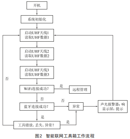 工作流程可以描述為:首先啟動(dòng)系統(tǒng)一初始化硬件一(A)通過指令切換UHF天線1一讀取UHF標(biāo)簽數(shù)據(jù)1一通過指令切換UHF天線2一讀取UHF標(biāo)簽數(shù)據(jù)2一通過指令切換UHF天線3一讀取UHF標(biāo)簽數(shù)據(jù)3一主控制器進(jìn)行UHF標(biāo)簽數(shù)據(jù)處理一判斷處于WiFi連接狀態(tài)一上傳標(biāo)簽數(shù)據(jù)結(jié)果一判斷處于藍(lán)牙連接狀態(tài)一啟動(dòng)工具箱防丟機(jī)制一上傳標(biāo)簽數(shù)據(jù)結(jié)果一聲光報(bào)警器一顯示屏刷新一返回(A),如圖2所示。