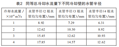 設(shè)定冷卻壁的冷卻水流量取值范圍為1×10-3~4×10-3m3/s , 計算同等總冷卻水流量下不同冷卻壁的水管半徑,如表2所示。