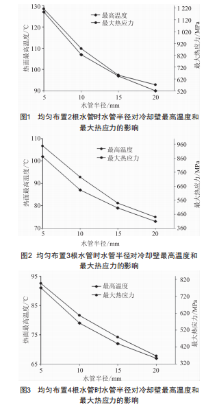 設(shè)定冷卻壁整體尺寸及邊界條件不變,分別計算冷卻壁內(nèi)均勻布置2根冷卻水管 (間距150mm)、3根水管 (間距100 mm)和4根水管(間距75 mm)時 ,水管半徑變化下的冷卻壁最高溫度和最大熱應(yīng)力。計算結(jié)果如圖1~3所示。