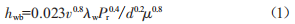 式中 ,億為冷卻水流速(m/s),設(shè)定為2 m/s:d為水管直徑(m): Aw、Pr、μ分別為30 ℃下水的物性參數(shù)。