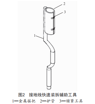 本文所述接地線快速裝拆輔助工具(圖2)由兩部分組成,分別是帶有鎖緊工具3的護管2和"幾"字形金屬搖把1。