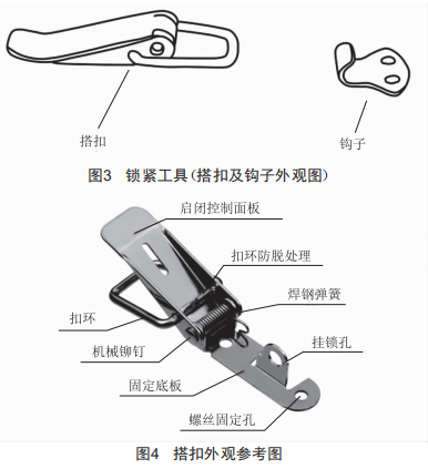 (2)帶有鎖緊工具的護管:它與"幾"字形金屬搖把前端固定。護管2一半通過螺絲固定孔連接鎖扣(圖3),一半通過螺絲固定孔連接鉤子(圖3),然后操作啟閉控制面板(圖4)使護管兩半夾緊。