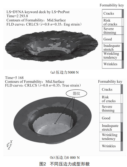 壓邊力過小時(shí),由于成型件反作用力大,壓邊力無法克服成型件反力,翹曲起皺為限制成型的主要因素。