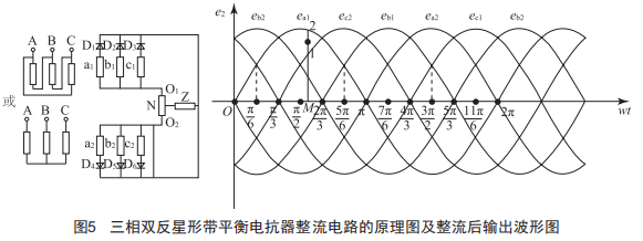 圖5為三相雙反星形帶平衡電抗器整流電路的原理圖以及經(jīng)整流電路整流后輸出的電流波形圖。
