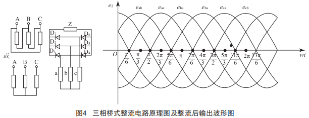 圖4為三相橋式整流電路的原理圖以及經(jīng)整流電路整流后輸出的電流波形圖。結(jié)合圖2,在周期