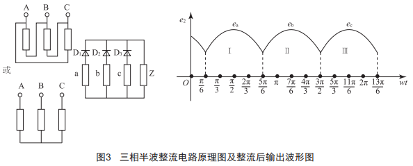 圖2為未經(jīng)整流電路輸出的三相電流波形圖,圖3為三相半波整流電路的原理圖以及經(jīng)整流電路整流后輸出的電流波形圖。在周期