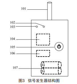 一種感應(yīng)式二次電纜對(duì)芯儀,由信號(hào)發(fā)生器和對(duì)芯器組成,其中信號(hào)發(fā)生器如圖3所示,主要包括:金屬探針(101)、電源指示燈(102)、發(fā)信指示燈(103)、音頻信號(hào)發(fā)生模塊(104)、電源按鈕(105)、放大模塊(106)、電池(107)。