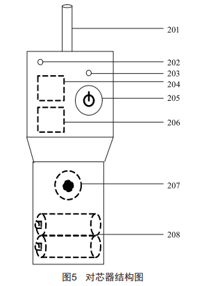 對(duì)芯器結(jié)構(gòu)示意圖如圖5所示,主要包括:金屬探針(201)、電源指示燈(202)、匹配指示燈(203)、檢測(cè)放大模塊(204)、電源按鈕(205)、抗干擾模塊(206)、揚(yáng)聲器(207)、電池(208)。