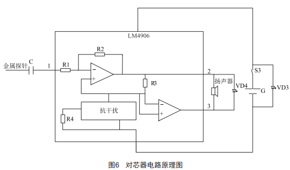 感應(yīng)式二次電纜對(duì)芯儀工作原理如圖2所示,當(dāng)按下s1電源開(kāi)關(guān)時(shí),VD1電源指示燈亮,信號(hào)發(fā)生器上電,按下s2發(fā)信按鈕,VD2對(duì)芯(發(fā)信)指示燈亮,電路被觸發(fā),KD9300高頻信號(hào)經(jīng)VT9011放大,三極管集電極便產(chǎn)生一個(gè)高頻信號(hào),由金屬探針輸出,金屬探針與電纜芯連接:另外一側(cè)對(duì)芯器中,當(dāng)按下s3電源開(kāi)關(guān)時(shí),對(duì)芯器金屬探針與電纜芯連接,當(dāng)兩側(cè)為同一電纜芯時(shí),信號(hào)經(jīng)電纜芯輸出至耦合電容C的耦合加到LM4906放大器的反相輸入端(1腳),LM4906內(nèi)部有兩個(gè)放大器,抗干擾電路濾除干擾信號(hào),信號(hào)放大后從Vo1(2腳)和Vo2(3腳)以電橋輸出的形式加到揚(yáng)聲器,發(fā)出"滴滴"聲,VD4指示燈閃爍,發(fā)出聲光提示。當(dāng)兩側(cè)不是同一電纜芯時(shí),對(duì)芯器無(wú)聲光提示。