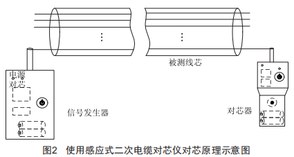 為解決以上問(wèn)題,我們研制了一套感應(yīng)式二次電纜對(duì)芯儀,其工作原理示意圖如圖2所示,它由信號(hào)發(fā)生器和對(duì)芯器組成,信號(hào)發(fā)生器發(fā)出的特定頻率的高頻信號(hào)通過(guò)二次電纜專用接口接入需要對(duì)芯的電纜,在電纜周圍產(chǎn)生環(huán)繞的信號(hào)場(chǎng),通過(guò)高靈敏度感應(yīng)式對(duì)芯器很快在對(duì)端識(shí)別出目標(biāo)信號(hào),由此確定電纜兩端是同一根電纜芯,也可用于運(yùn)行電纜備用芯查找。