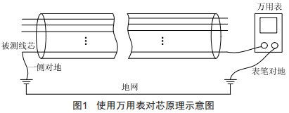 在二次施工、作業(yè)過(guò)程中,對(duì)芯是確保二次電纜接線正確的重要步驟。傳統(tǒng)作業(yè)方法中,對(duì)芯是將電纜芯一端對(duì)地,另一端用萬(wàn)用表測(cè)量對(duì)地是否導(dǎo)通,如圖1所示。