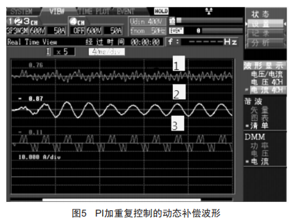 圖5中,曲線+為補償電流波形,曲線2為電網(wǎng)電流波形,曲線3為負(fù)載電流波形。于圖示時刻突加負(fù)載,可以看到,采用該單相諧波檢測方法并輔以重復(fù)控制加PI的電流跟蹤方法所設(shè)計的有源電力濾波器系統(tǒng),能夠在半個電網(wǎng)周期內(nèi)完全補償諧波及無功電流,實現(xiàn)單位功率因數(shù),動態(tài)性能較好,穩(wěn)態(tài)性能同樣突出,比較適用于新能源汽車充電站的場合。