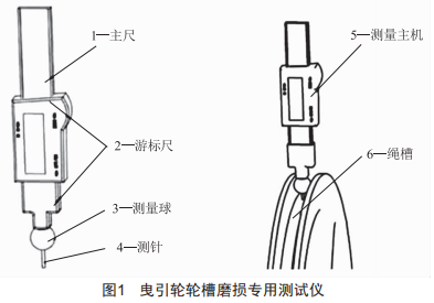 (3)曳引輪輪槽磨損專用測試儀。其結(jié)構(gòu)如圖1所示,組成主要包括主尺1、游標(biāo)尺2、測量球3、測針4,同時配備5種規(guī)格專用調(diào)整球各1個,直徑分別為8mm、10mm、12mm、13mm、16mm。其測量方法為:儀器經(jīng)過精密校準(zhǔn)后,將測量球3放在繩槽6內(nèi),下壓主尺1,使測針4碰觸繩槽6底部,此時測量數(shù)據(jù)在主尺1上的游標(biāo)尺2讀取。主尺1與測針4相連,從測量球3中間孔穿過。曳引輪輪槽磨損專用測試儀中主尺1、游標(biāo)尺2與測針4為一體化設(shè)計,集成于主尺1上,測量球3為中間有孔的半球形金屬裝置。該測試儀測量精度可達(dá)0.01mm,測量靈敏度及精度高。