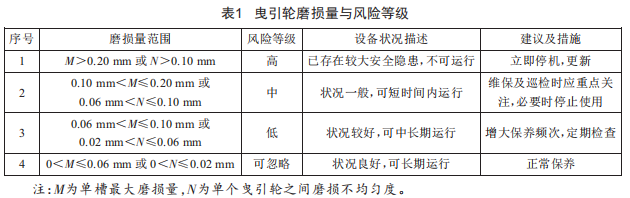 通過對常見品牌、型號規(guī)格的500臺電梯的定期檢驗及48臺老舊電梯的評估,發(fā)現(xiàn)曳引輪磨損量與風(fēng)險等級有如表1所示的關(guān)系。
