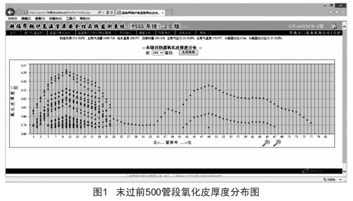從圖中我們可以看到,割管檢查的氧化皮堵塞分布情況(上部咖啡色點(diǎn)為割管檢查堵塞的管子所對應(yīng)的屏號)與PSSS系統(tǒng)末過氧化皮厚度自動統(tǒng)計的分布規(guī)律基本一致。
