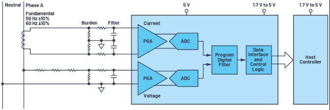 圖1.電源監(jiān)控應用中的典型信號鏈。為簡潔起見,僅顯示一個相位
