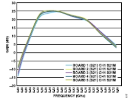 EVAL-CN0534-EBZ在5.8 GHz中心頻率下,將RF信號(hào)輸入放大約+23 dB增益,回波損耗為?15 dB。圖18和圖19顯示了EVAL-CN0534-EBZ的增益和回波損耗。