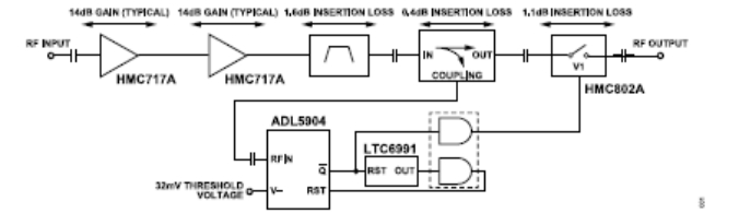 如圖2所示,在其RF工作頻段內(nèi),HMC717A具有14.5 dB增益。噪聲系數(shù)為1.1 dB,放大器由一個(gè)5 V電源供電,總電源電流為68 mA。為了實(shí)現(xiàn)23 dB總增益,將兩個(gè)HMC717A放大器級(jí)聯(lián)。HMC717A提供1.1 dB噪聲系數(shù)、27 dBm 3階交調(diào)點(diǎn)(IP3)和15 dB壓縮點(diǎn)(P1dB),適用于第一級(jí)LNA,也適用于中間增益級(jí)。