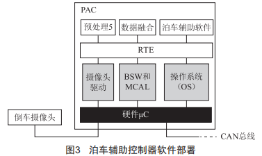 針對泊車輔助功能,按圖1在PREEviSiOn中搭建泊車輔助功能軟件架構(gòu)模型(SWC、端口、Interface/DE、數(shù)據(jù)類型等),并進一步詳細定義各SWC的內(nèi)部行為,如RTEEvent、Runnab1e、變量等。這些軟件組件屬于AUTOSAR應(yīng)用層,完全獨立于硬件,可在不同項目、不同平臺中實現(xiàn)復(fù)用。之后,將各功能部署到對應(yīng)控制器并進行信號路由,完成通信層設(shè)計。表1是泊車輔助系統(tǒng)功能軟件組件定義,圖3是泊車輔助控制器(PAC)的功能部署實例。