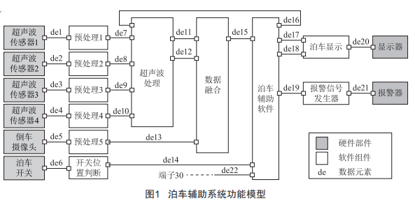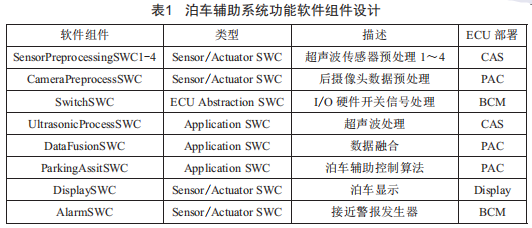 以泊車輔助功能為例,利用內(nèi)嵌在車后保險杠上的4個接近傳感器(超聲波傳感器)探測后方障礙物,根據(jù)車輛接近障礙物的距離,發(fā)出不同頻率的警告聲。后視攝像頭提供倒車可視畫面,整個輔助系統(tǒng)可以由駕駛員使能(選擇激活或者不激活)。采用基于模型的功能開發(fā)思路,將系統(tǒng)的功能拆解為各個小功能塊,如傳感器數(shù)據(jù)預(yù)處理模塊、數(shù)據(jù)融合模塊、泊車輔助算法等,分別對應(yīng)不同的軟件組件(SWC),各功能塊之間通過AUT0SAR標準接口(如S/R、C/S接口等)進行數(shù)據(jù)交互。泊車輔助系統(tǒng)的功能模型如圖1所示。