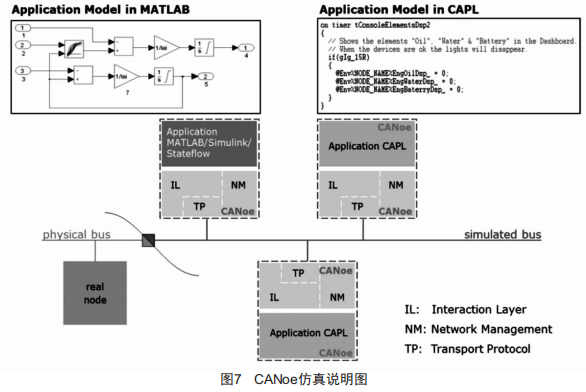 在前期系統(tǒng)功能設(shè)計過程中,可以輔助以仿真工具進行模擬及驗證確保前期功能邏輯以及通信矩陣設(shè)計的正確性。仿真的通信數(shù)據(jù)庫arxml文件由PREEviSiOn導(dǎo)出,導(dǎo)入CANOe中可自動生成整個網(wǎng)絡(luò)模型。前期的功能邏輯可以由CAPL進行編寫,也可以利用Simulink中搭建好的算法模型,轉(zhuǎn)化為d11庫文件。將d11文件導(dǎo)入CANOe仿真工程中對應(yīng)的節(jié)點便可進行功能仿真,驗證算法邏輯正確性。CANOe中系統(tǒng)仿真示意如圖7所示。