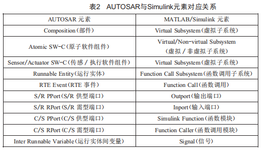 基于Simu1ink的軟件組件開發(fā)主要是對AUTOSAR軟件組件內(nèi)部行為(Interna1BehaviOr)的實現(xiàn),即實現(xiàn)運行實體(Runnab1eEntity)中的內(nèi)部控制算法。PREEviSiOn/AUTOSAR中模型元素和MATLAB/Simu1ink元素對照如表2所示。