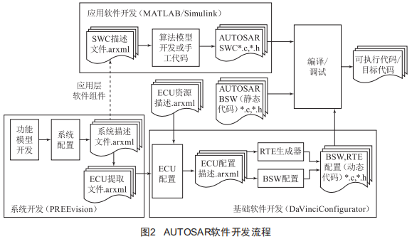 功能模型開發(fā)是控制器軟件開發(fā)的基礎(chǔ),控制器最終的軟件開發(fā)取決于功能塊的部署。一種基于AUT0SAR的車用控制器軟件開發(fā)流程如圖2所示。